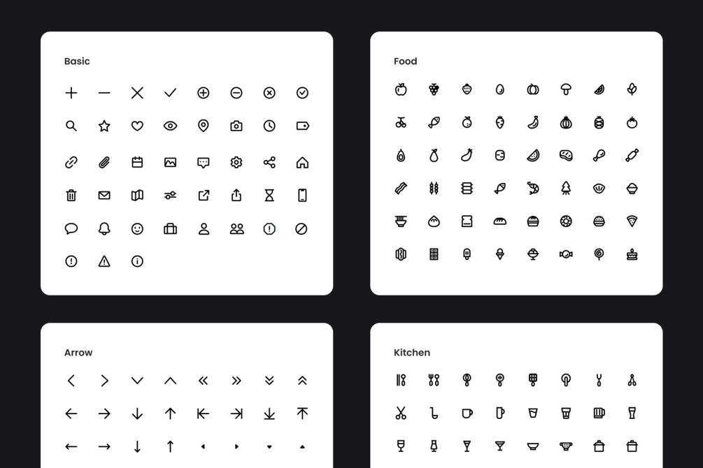 어떤 디지털 디바이스에서 또렷하게 보일 수 있게 Pixel Perfection을 맞췄습니다. 8pt 그리드 기반 레이아웃에서 사용하는 24pt 그리드 기반의 아이콘 라이브러리입니다. 단단하면서도 우아하고 부드러운 인상을 주기 위해 2pt의 굵기에 둥근 끝과 꺽임을 적용했습니다. Border Position은 상황에 따라 Center와 Inner를 혼합했습니다.